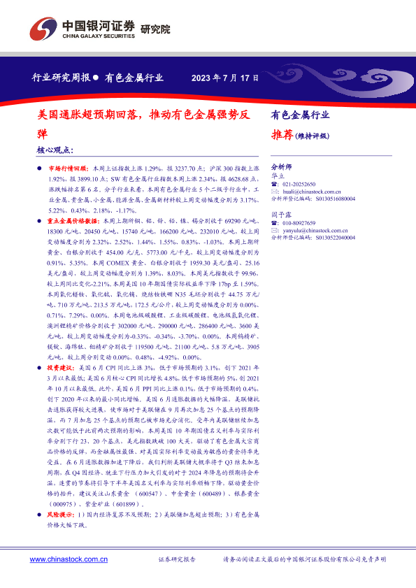 【银河证券】【20230717】20230717-中国银河-有色金属行业研究周报:美国通胀超预期回落,推动有色金属强势反弹-18页