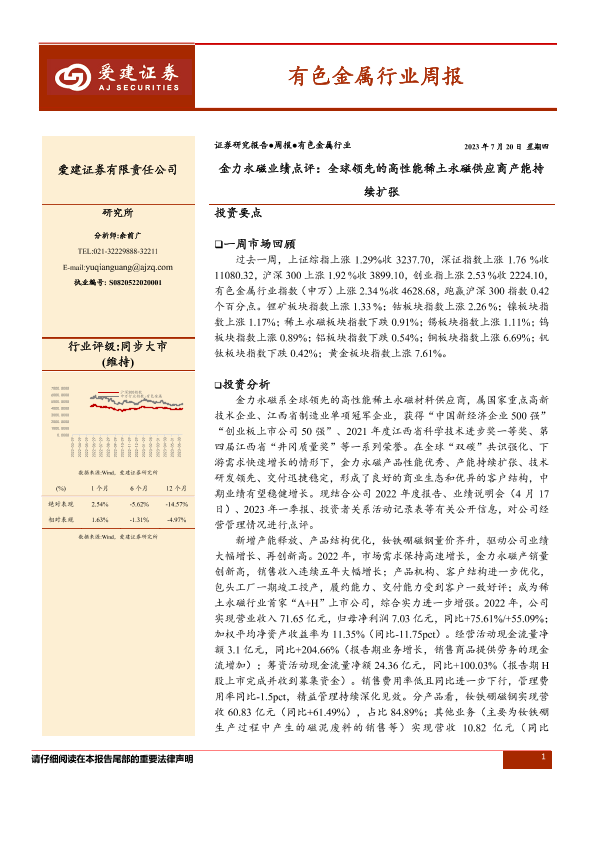 【爱建证券】【20230720】20230720-爱建证券-有色金属行业周报:金力永磁业绩点评:全球领先的高性能稀土永磁供应商产能持续扩张-44页