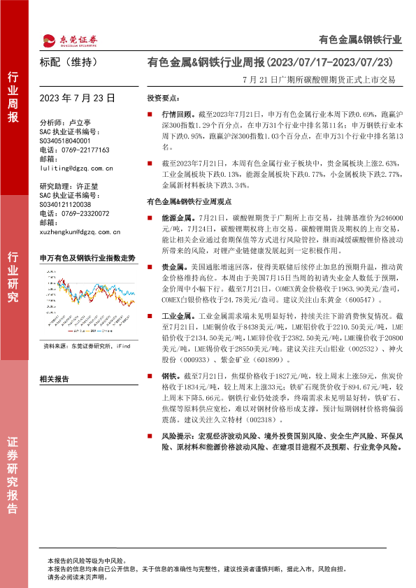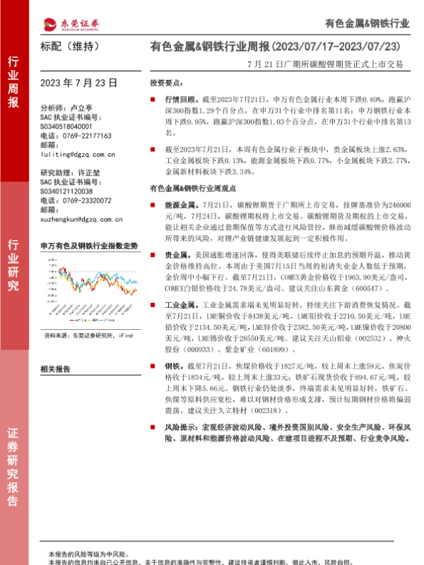 【东莞证券】【20230723】20230723-东莞证券-有色金属&钢铁行业周报:7月21日广期所碳酸锂期货正式上市交易-13页