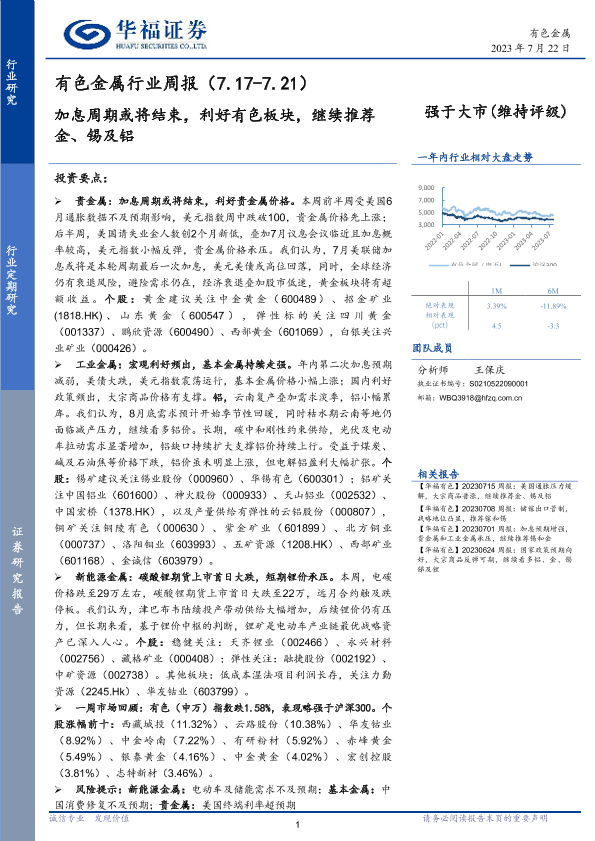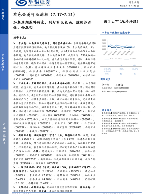 【华福证券】【20230722】20230722-华福证券-有色金属行业周报:加息周期或将结束,利好有色板块,继续推荐金、锡及铝-16页