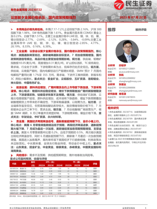 【民生证券】【20230722】20230722-民生证券-有色金属周报:议息前夕金属价格承压,国内政策预期强烈-27页