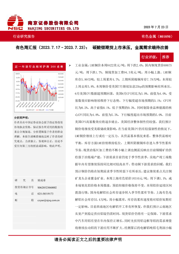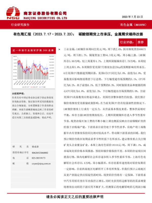 【南京证券】【20230723】20230723-南京证券-有色周汇报:碳酸锂期货上市承压,金属需求端待改善-10页