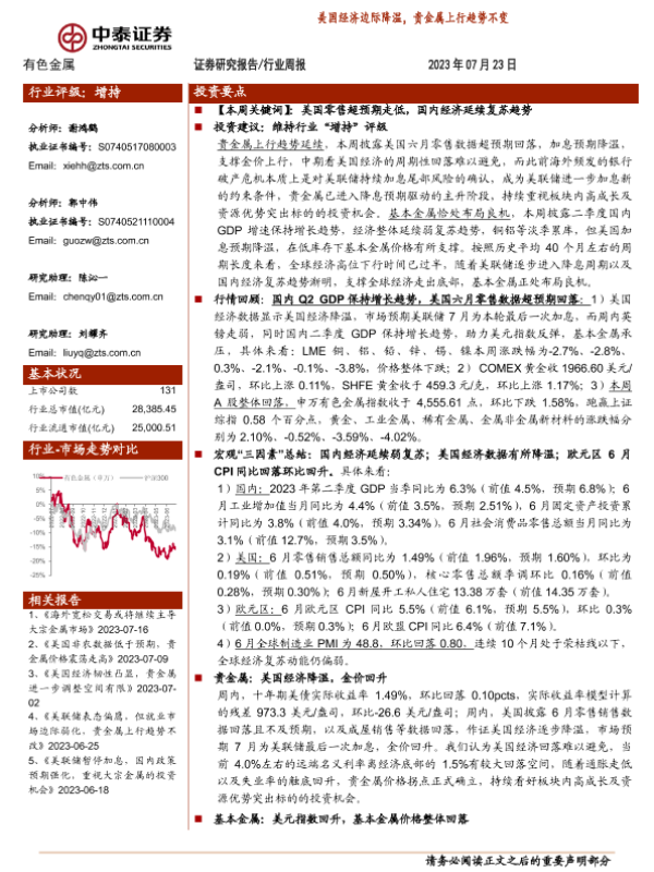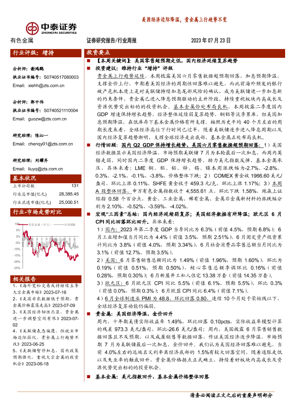 【中泰证券】【20230723】20230723-中泰证券-有色金属行业周报:美国经济边际降温,贵金属上行趋势不变-32页