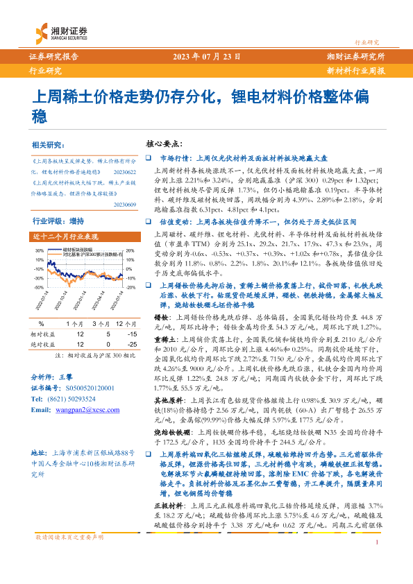 【湘财证券】【20230723】20230723-湘财证券-新材料行业周报:上周稀土价格走势仍存分化,锂电材料价格整体偏稳-12页