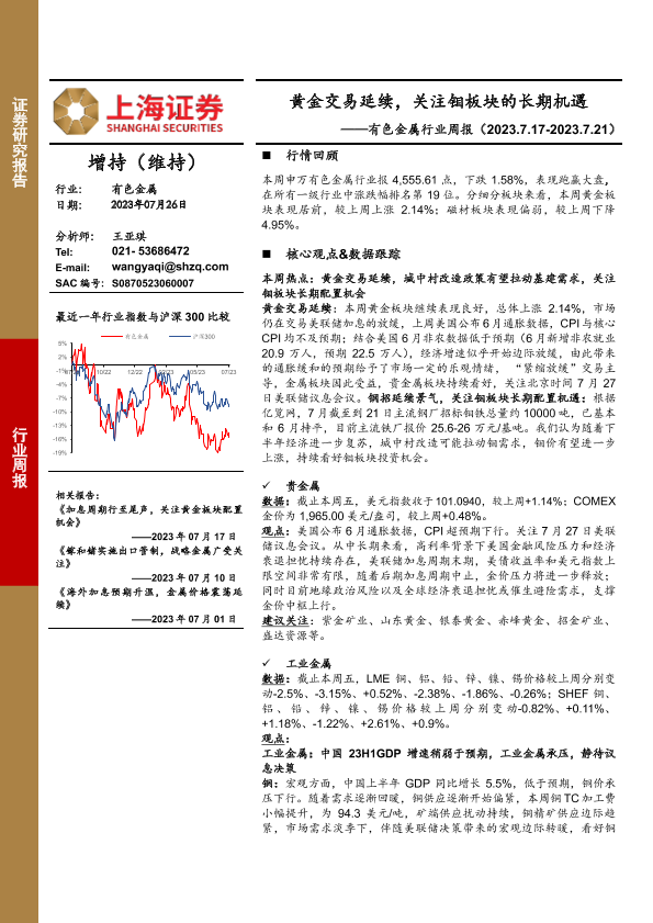 【上海证券】【20230726】20230726-上海证券-有色金属行业周报:黄金交易延续,关注钼板块的长期机遇-17页