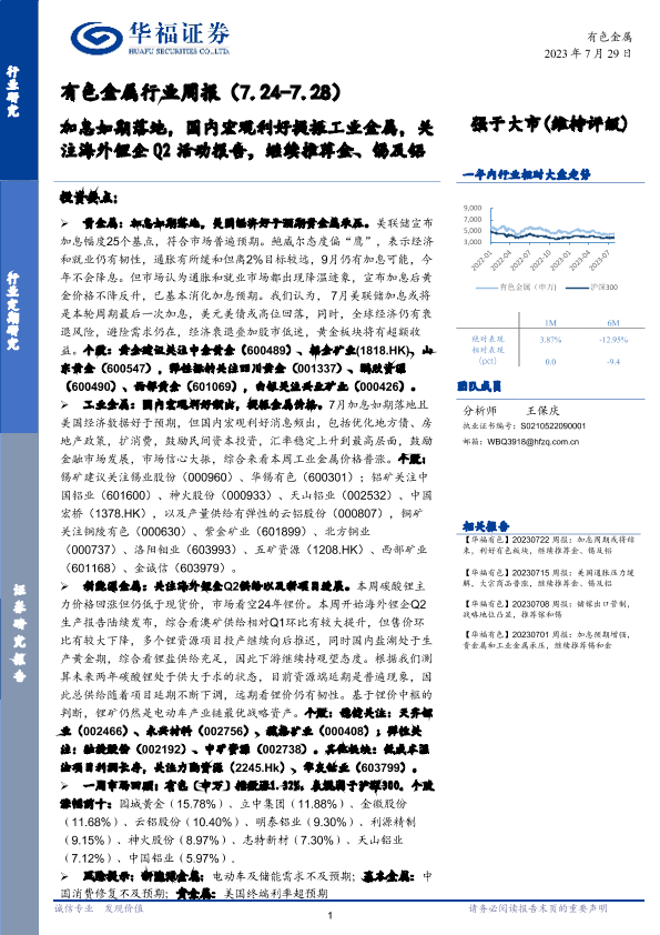 【华福证券】【20230729】20230729-华福证券-有色金属行业周报:加息如期落地,国内宏观利好提振工业金属,关注海外锂企Q2活动报告,继续推荐金、锡及铝-18页