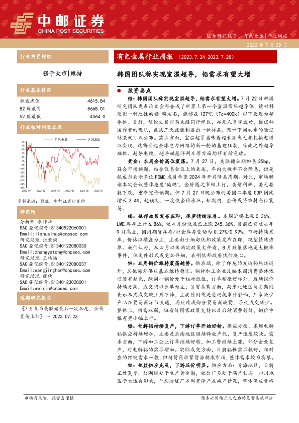 【中邮证券】【20230729】20230729-中邮证券-有色金属行业周报:韩国团队称实现室温超导,铅需求有望大增-15页