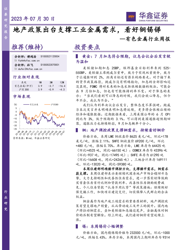 【华鑫证券】【20230730】20230730-华鑫证券-有色金属行业周报:地产政策出台支撑工业金属需求,看好铜锡锑-15页