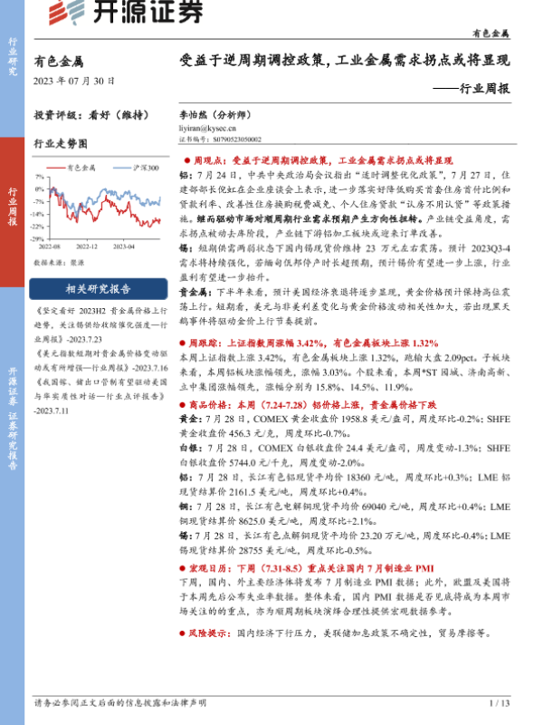 【开源证券】【20230730】20230730-开源证券-有色金属行业周报:受益于逆周期调控政策,工业金属需求拐点或将显现-13页