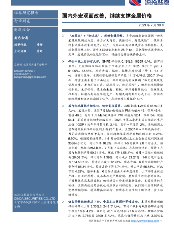 【信达证券】【20230730】20230730-信达证券-有色金属周度报告:国内外宏观面改善,继续支撑金属价格-12页