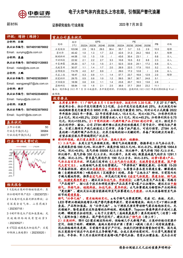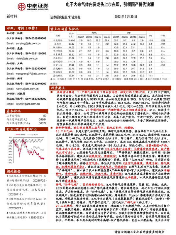 【中泰证券】【20230730】20230730-中泰证券-新材料行业周报:电子大宗气体内资龙头上市在即,引领国产替代浪潮-10页