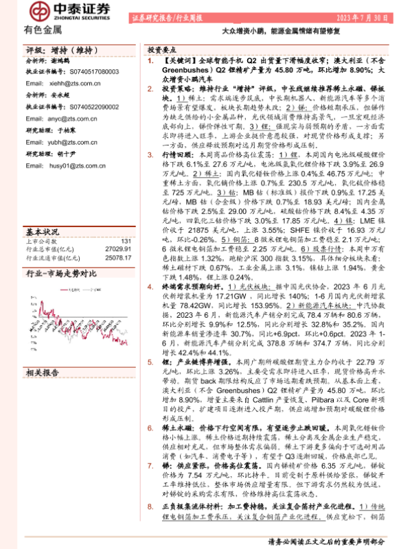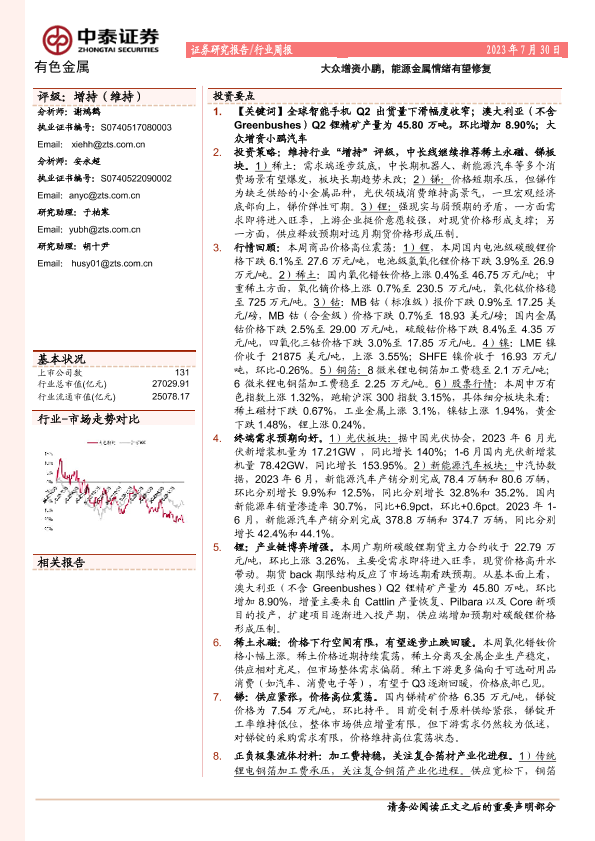 【中泰证券】【20230730】20230730-中泰证券-有色金属行业周报:大众增资小鹏,能源金属情绪有望修复-21页