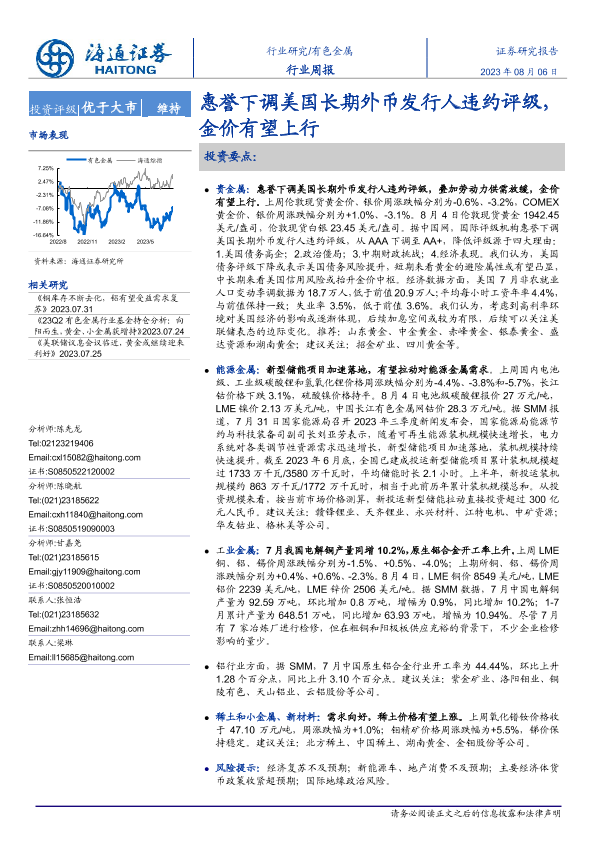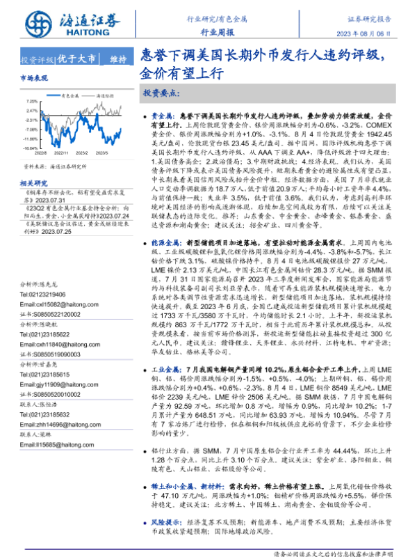 【海通证券】【20230806】20230806-海通证券-有色金属行业周报:惠誉下调美国长期外币发行人违约评级,金价有望上行-14页