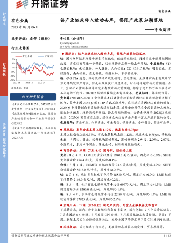 【开源证券】【20230806】20230806-开源证券-有色金属行业周报:铝产业链或转入被动去库,锡限产政策如期落地-13页