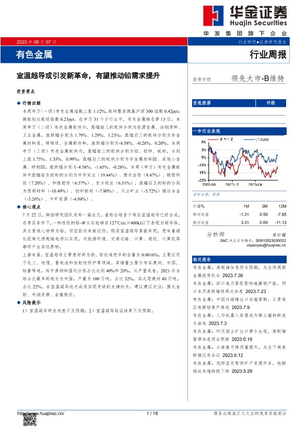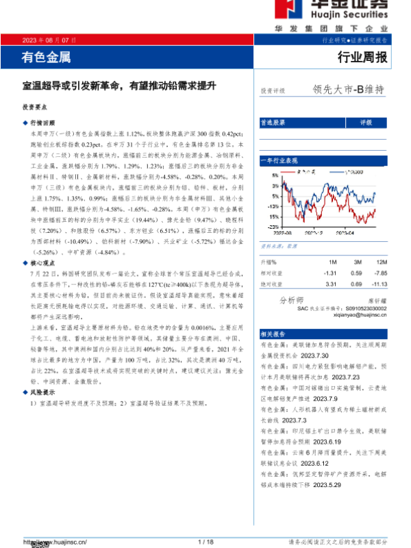 【华金证券】【20230807】20230807-华金证券-有色金属行业周报:室温超导或引发新革命,有望推动铅需求提升-18页