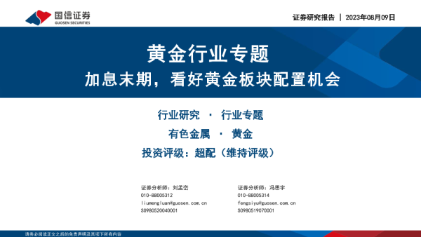 【国信证券】【20230809】20230809-国信证券-黄金行业专题:加息末期,看好黄金板块配置机会-22页