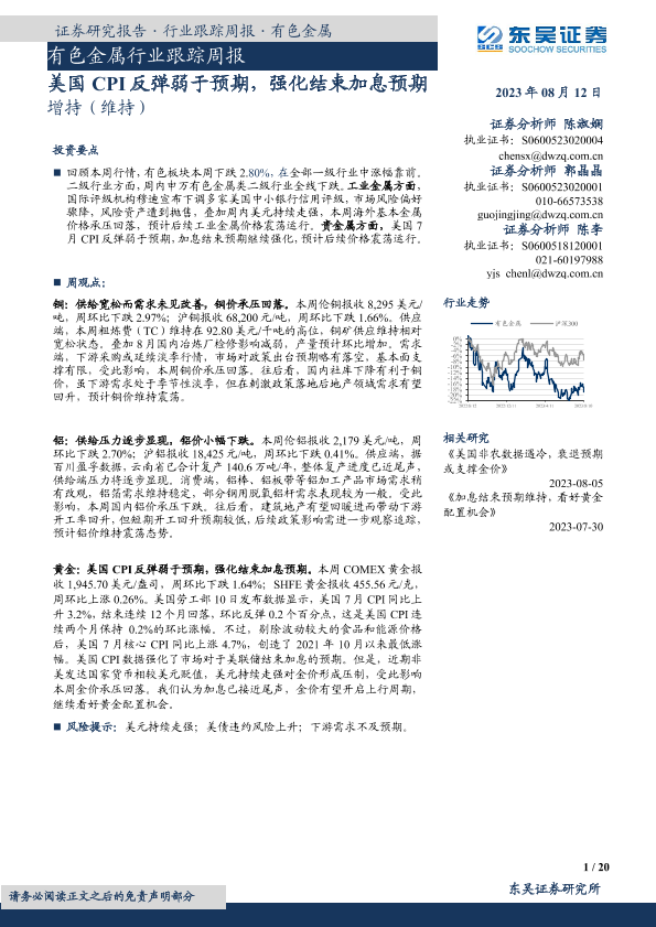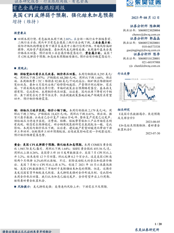 【东吴证券】【20230812】20230812-东吴证券-有色金属行业跟踪周报:美国CPI反弹弱于预期,强化结束加息预期-20页