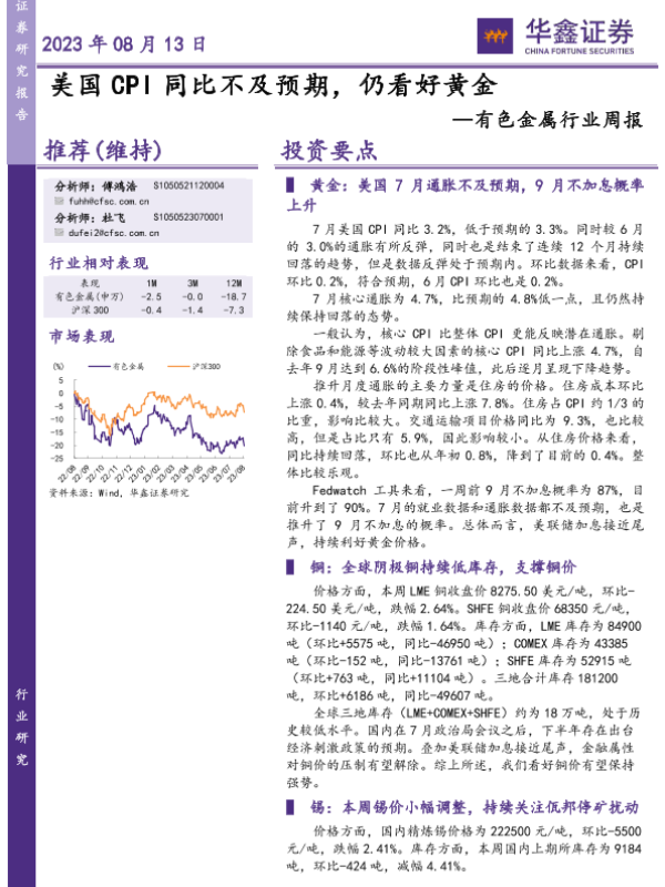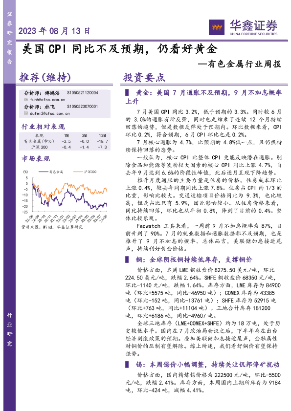 【华鑫证券】【20230813】20230813-华鑫证券-有色金属行业周报:美国CPI同比不及预期,仍看好黄金-16页