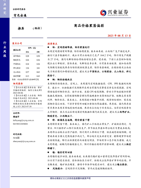 【兴业证券】【20230813】20230813-兴业证券-有色金属行业周报:商品价格震荡偏弱-18页