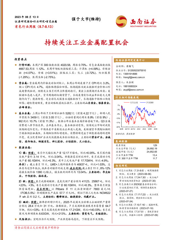 【西南证券】【20230813】20230813-西南证券-有色行业周报:持续关注工业金属配置机会-23页