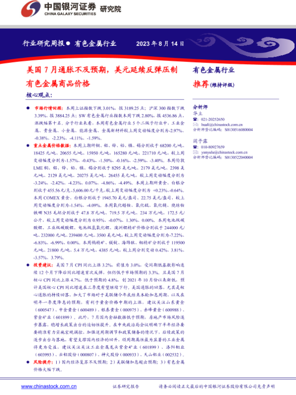 【银河证券】【20230814】20230814-中国银河-有色金属行业行业研究周报:美国7月通胀不及预期,美元延续反弹压制有色金属商品价格-20页