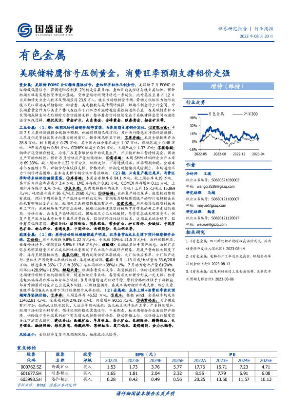 【国盛证券】【20230820】国盛证券-有色金属行业周报:美联储转鹰信号压制黄金,消费旺季预期支撑铝价走强-33页