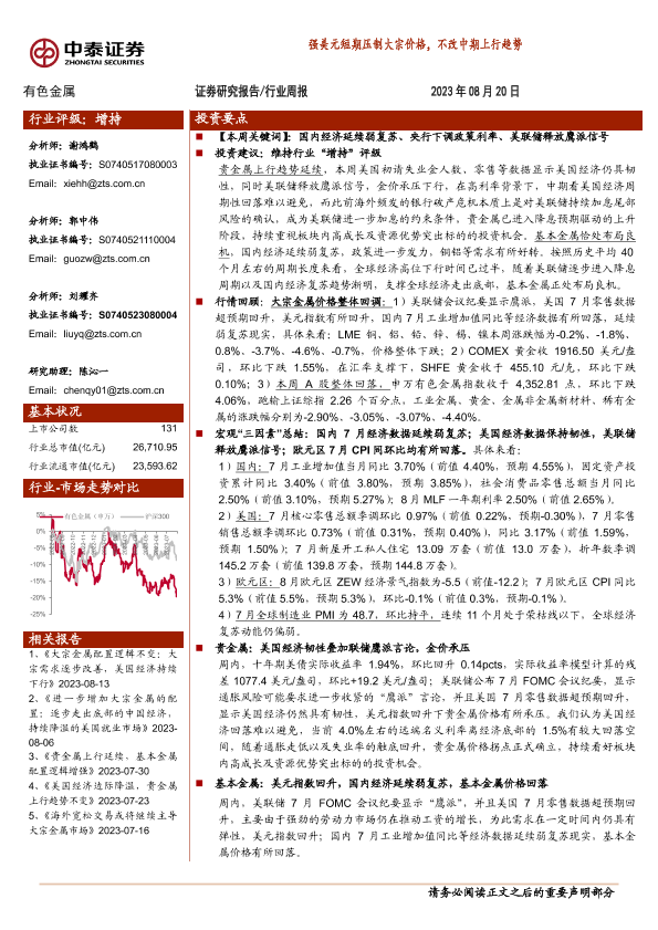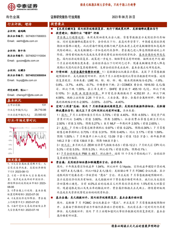 【中泰证券】【20230820】中泰证券-有色金属行业周报:强美元短期压制大宗价格,不改中期上行趋势-32页