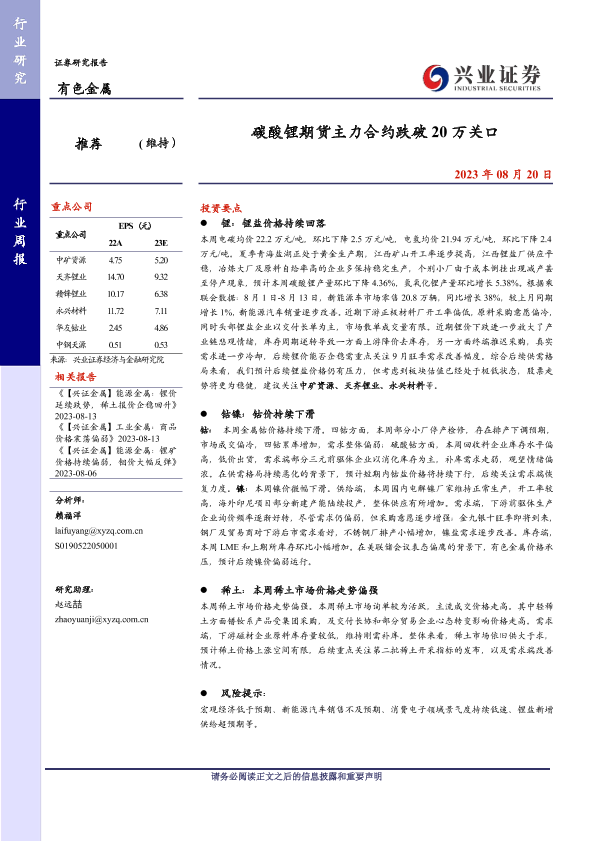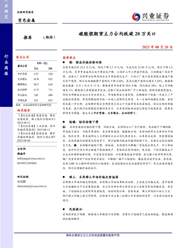 【兴业证券】【20230820】碳酸锂期货主力合约跌破20万关口-18页