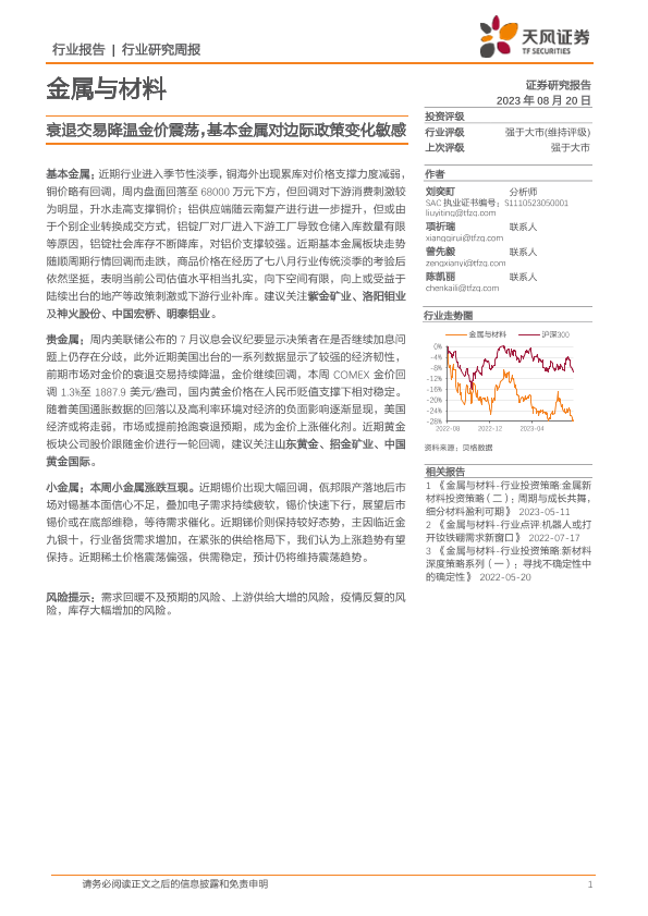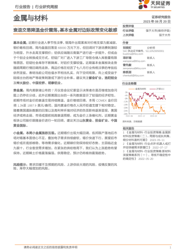 【天风证券】【20230820】金属与材料行业研究周报:衰退交易降温金价震荡,基本金属对边际政策变化敏感-14页