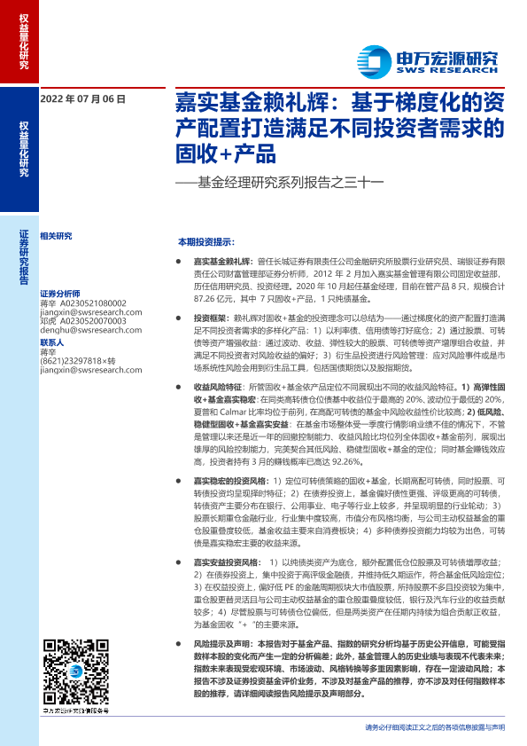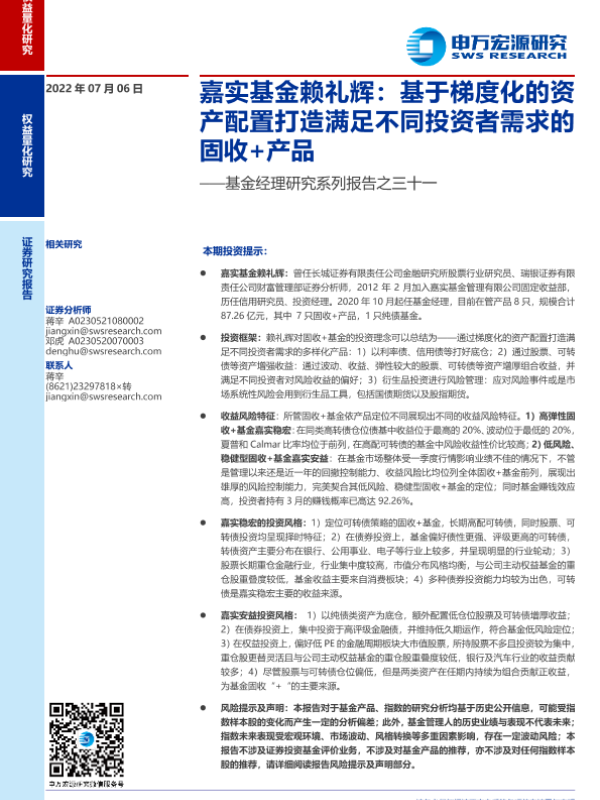 【申万宏源】【20220706】基金经理研究系列报告之三十一:嘉实基金赖礼辉,基于梯度化的资产配置打造满足不同投资者需求的固收+产品-31页