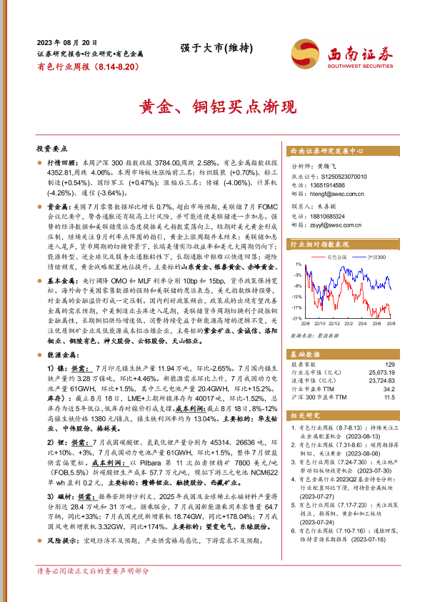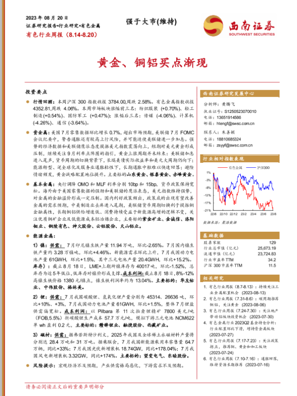 【西南证券】【20230820】20230820-西南证券-有色行业周报:黄金、铜铝买点渐现-23页