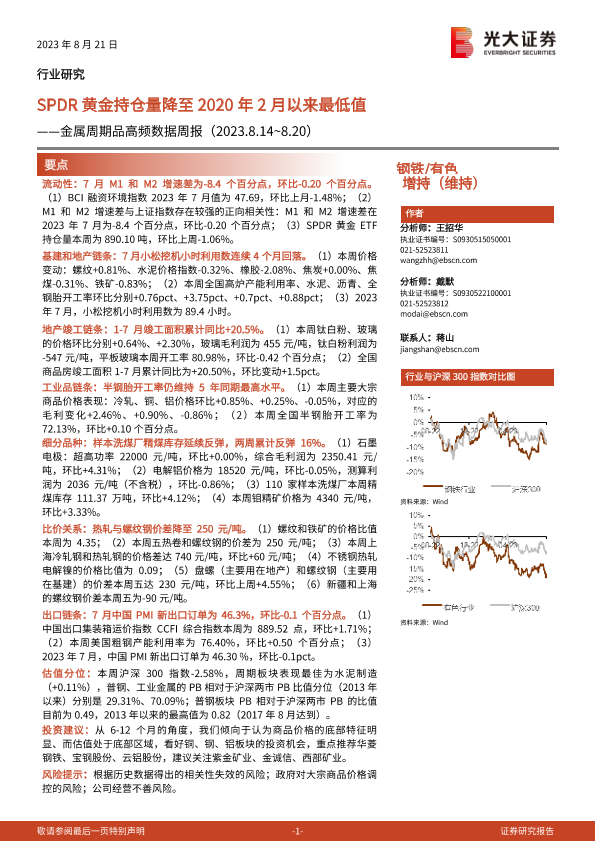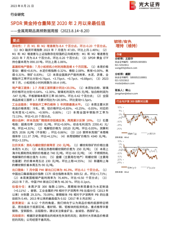【光大证券】【20230821】20230821-光大证券-钢铁 有色行业金属周期品高频数据周报:SPDR黄金持仓量降至2020年2月以来最低值-26页