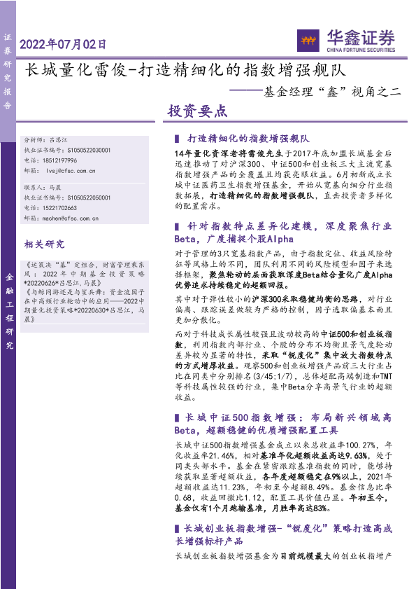 【华鑫证券】【20220702】基金经理“鑫”视角之二:长城量化雷俊_打造精细化的指数增强舰队-20页