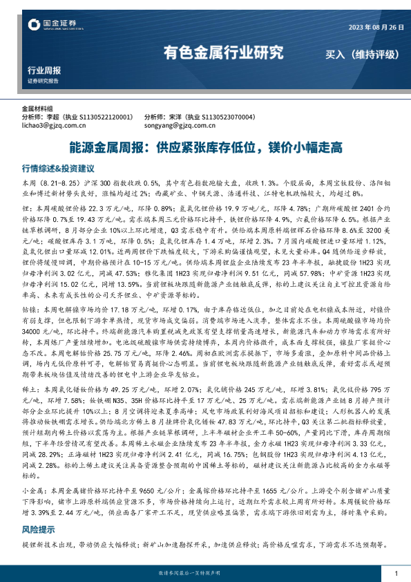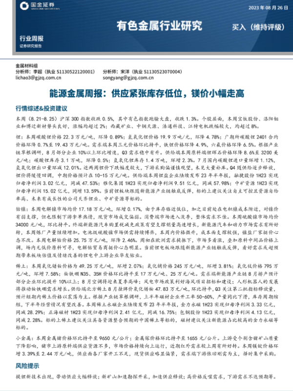 【国金证券】【20230826】20230826-国金证券-能源金属周报:供应紧张库存低位,镁价小幅走高-16页