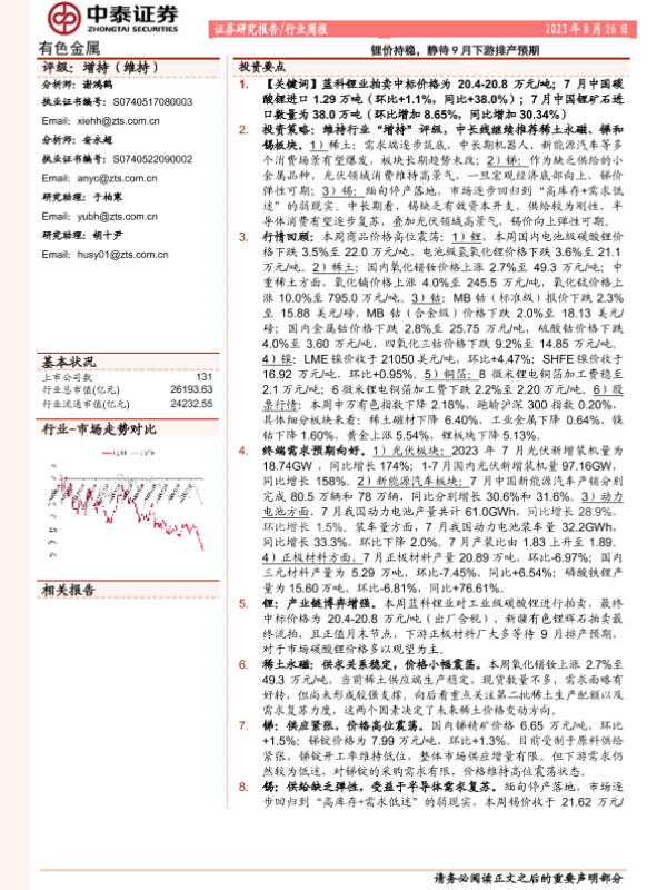 【中泰证券】【20230826】20230826-中泰证券-有色金属行业周报:锂价持稳,静待9月下游排产预期-22页