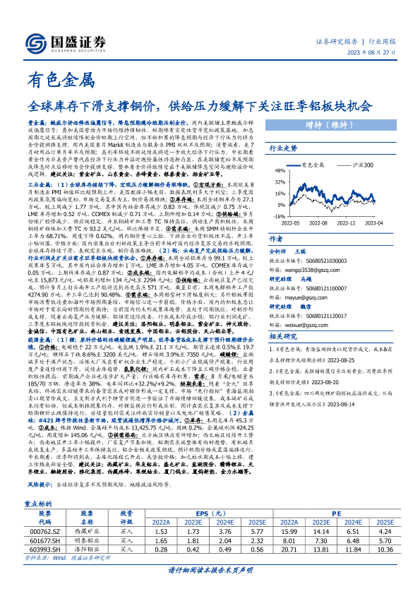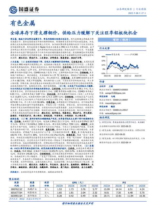 【国盛证券】【20230827】20230827-国盛证券-有色金属行业周报:全球库存下滑支撑铜价,供给压力缓解下关注旺季铝板块机会-33页