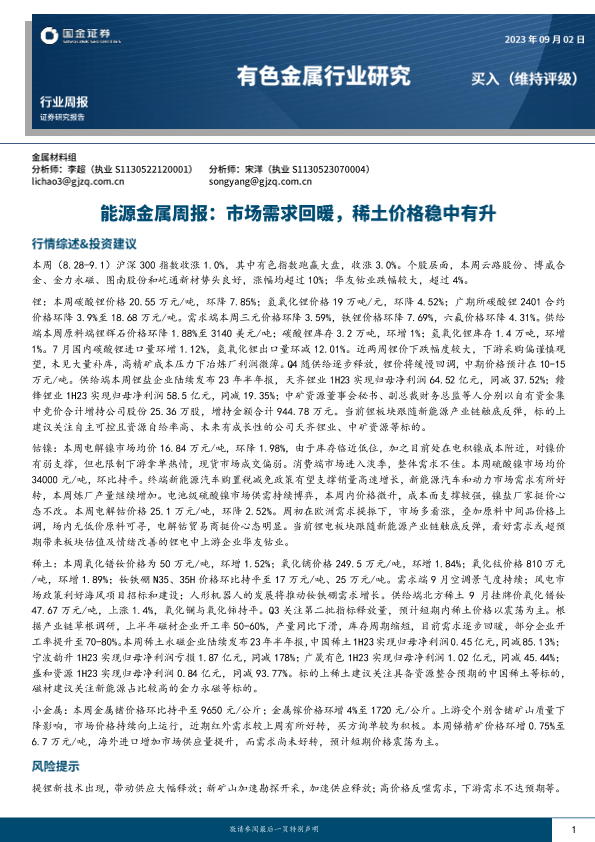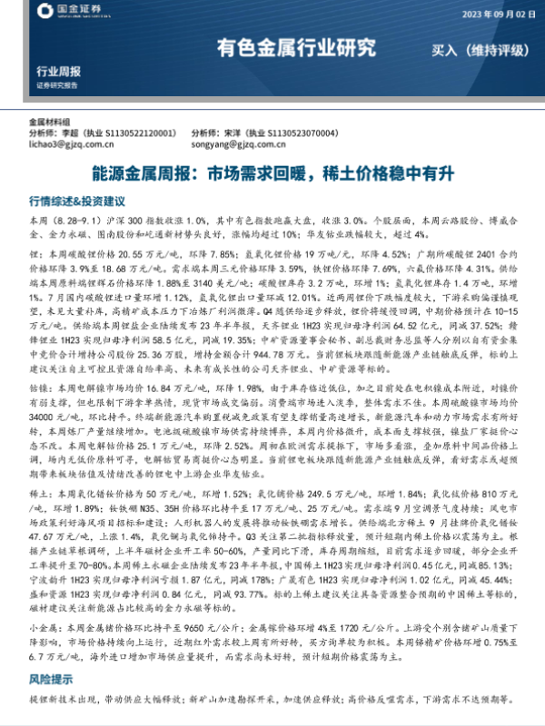 【国金证券】【20230902】20230902-国金证券-能源金属周报:市场需求回暖,稀土价格稳中有升-16页