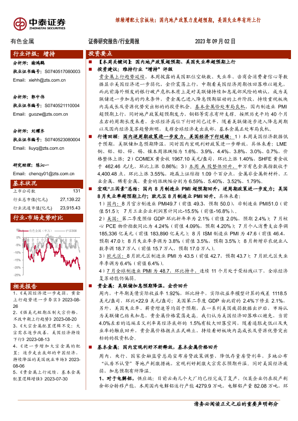 【中泰证券】【20230902】20230902-中泰证券-有色金属行业周报:继续增配大宗板块:国内地产政策力度超预期,美国失业率有所上行-31页