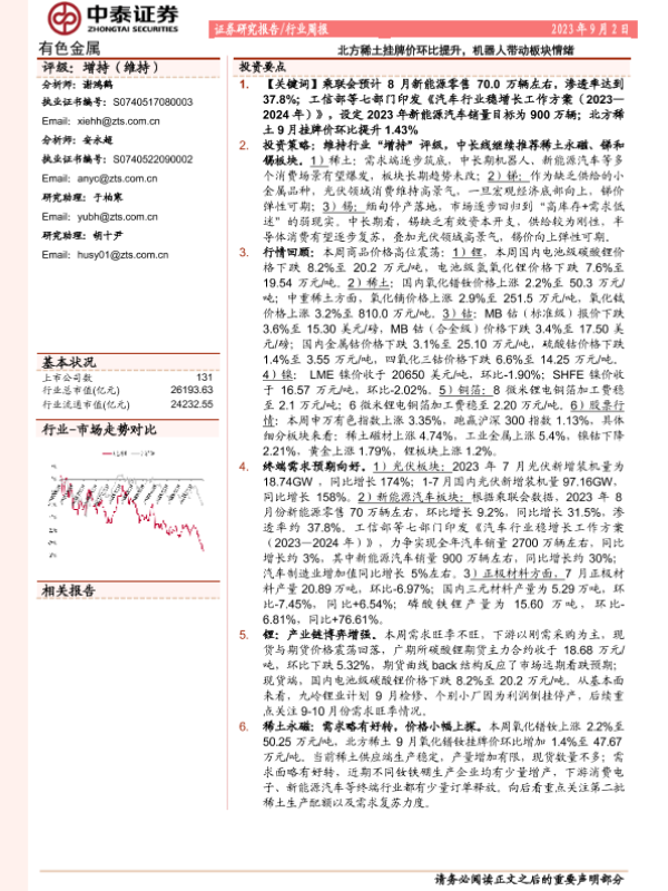 【中泰证券】【20230902】20230902-中泰证券-有色金属行业周报:北方稀土挂牌价环比提升,机器人带动板块情绪-22页