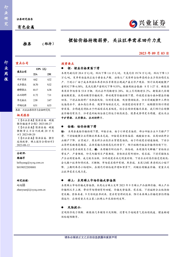【兴业证券】【20230903】20230903-兴业证券-有色金属行业周报:锂钴价格持续弱势,关注旺季需求回升力度-17页