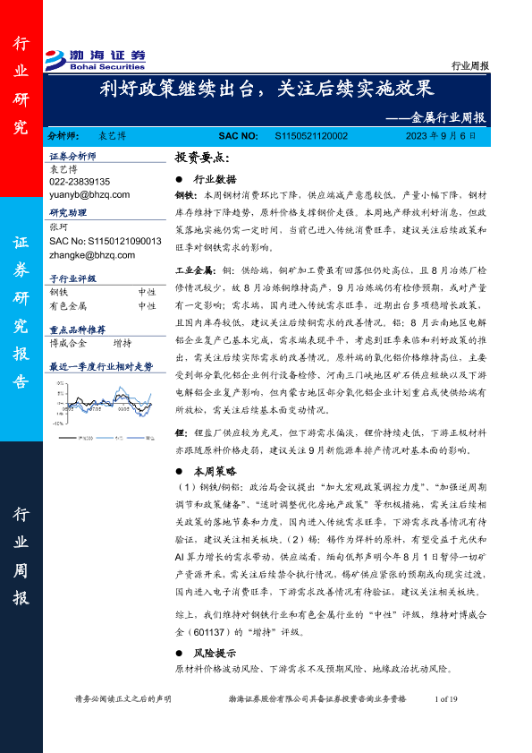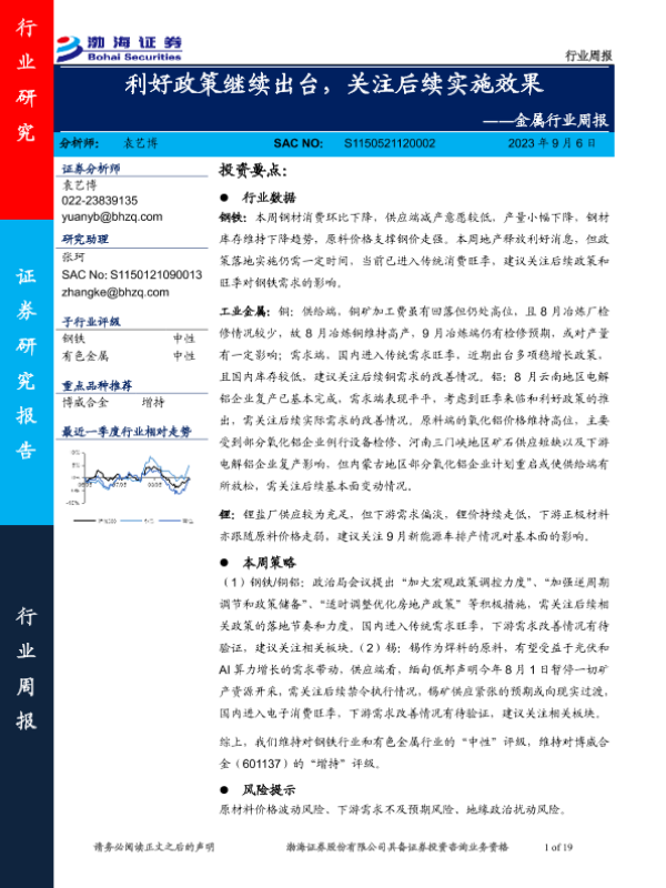 【渤海证券】【20230906】20230906-渤海证券-金属行业周报:利好政策继续出台,关注后续实施效果-19页