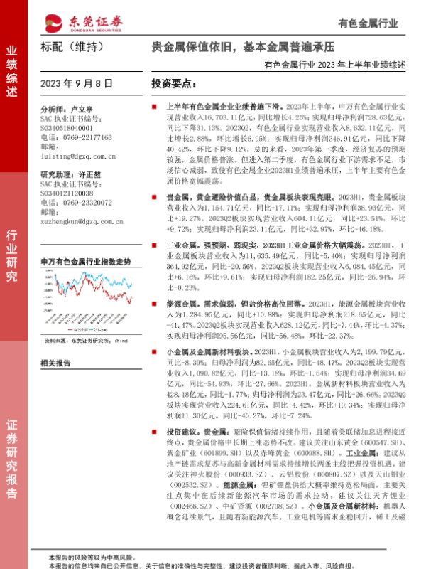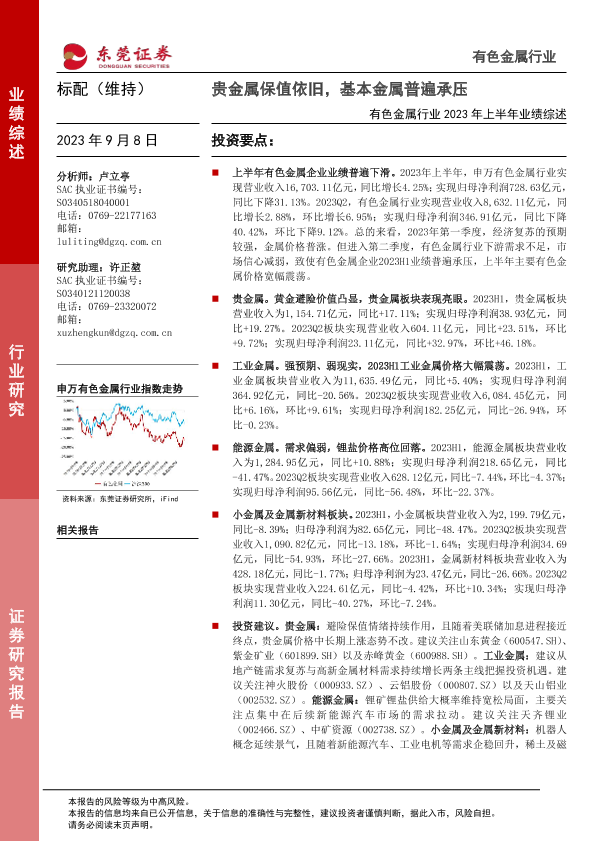 【东莞证券】【20230908】有色金属行业2023年上半年业绩综述:贵金属保值依旧,基本金属普遍承压-24页