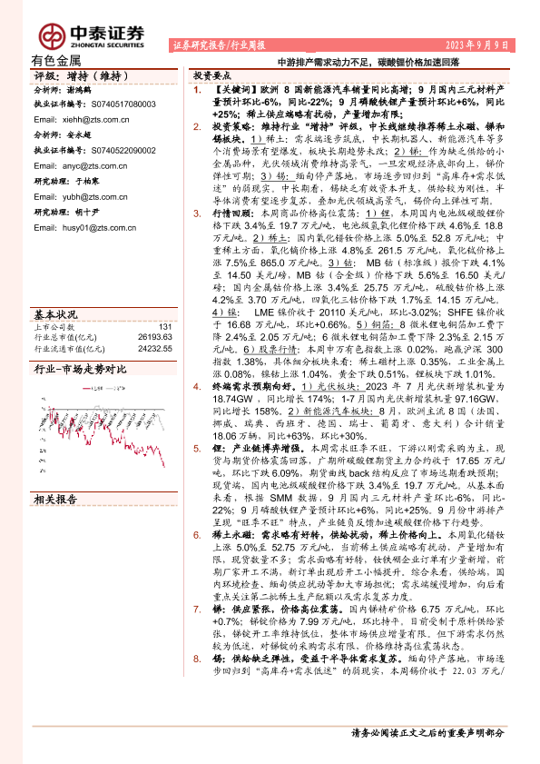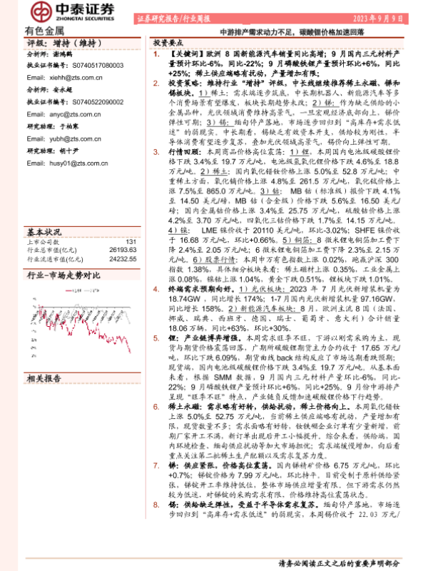 【中泰证券】【20230909】20230909-中泰证券-有色金属行业周报:中游排产需求动力不足,碳酸锂价格加速回落-22页