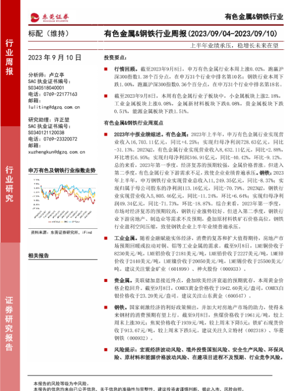【东莞证券】【20230910】20230910-东莞证券-有色金属&钢铁行业周报:上半年业绩承压,稳增长未来在望-14页