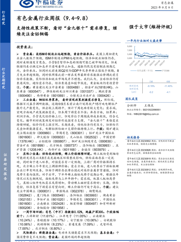 【华福证券】【20230909】20230909-华福证券-有色金属行业周报:支持性政策不断,看好“金九银十”需求修复,继续关注金铝铜锡-16页