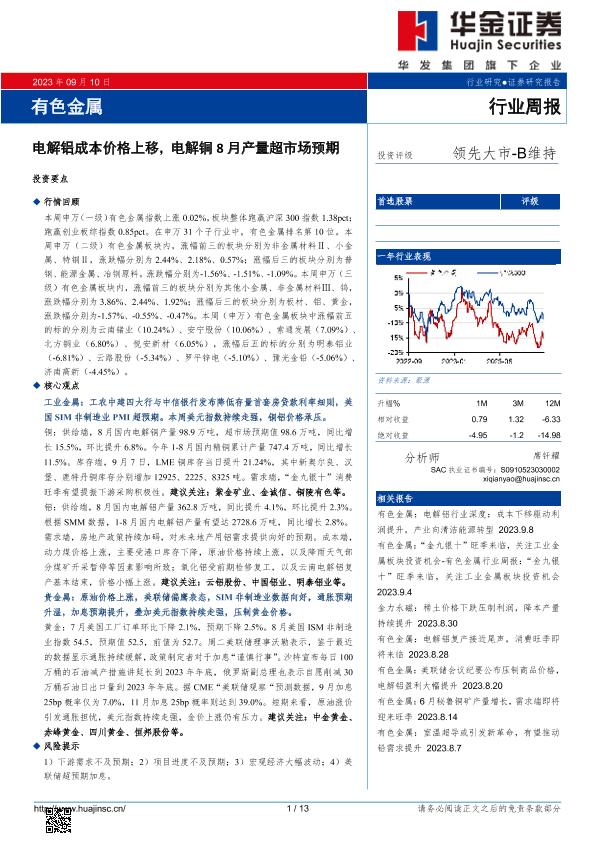 【华金证券】【20230910】20230910-华金证券-有色金属行业周报:电解铝成本价格上移,电解铜8月产量超市场预期-13页