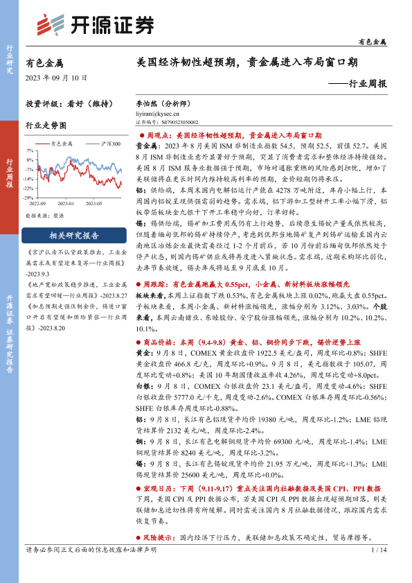 【开源证券】【20230910】20230910-开源证券-有色金属行业周报:美国经济韧性超预期,贵金属进入布局窗口期-14页