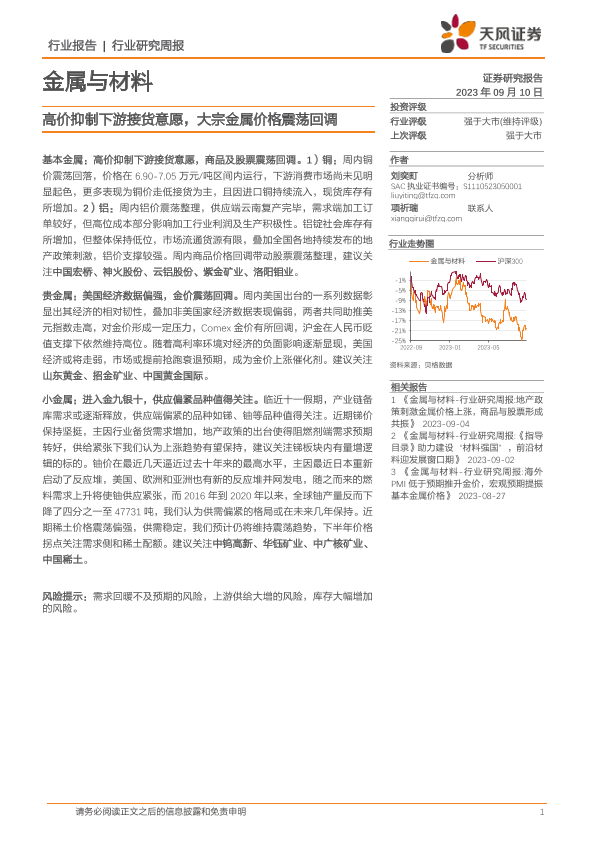 【天风证券】【20230910】20230910-天风证券-金属与材料行业研究周报:高价抑制下游接货意愿,大宗金属价格震荡回调-14页