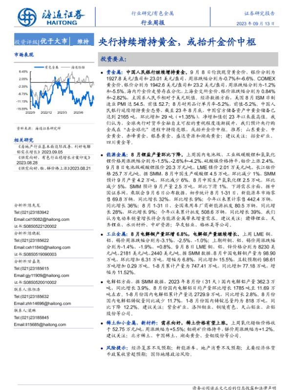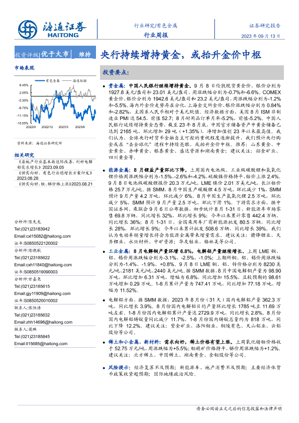 【海通证券】【20230913】海通证券-有色金属行业周报:央行持续增持黄金,或抬升金价中枢-14页