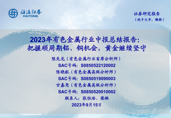 【海通证券】【20230915】2023年有色金属行业中报总结报告:把握顺周期铝、铜机会,黄金继续坚守-25页